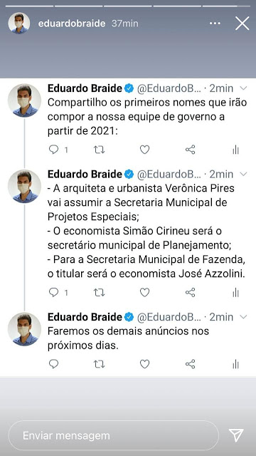 O prefeito eleito de São Luís, Eduardo Braide, anunciou os primeiros nomes do seu secretariado. No Instagram, ele informou que nos próximos dias divulgará novos titulares de pastas.