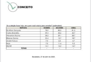 Um novo levantamento realizado pelo Instituto Conceito, feito em 27 de abril de 2025, confirma a liderança absoluta do ex-prefeito Dr. Hilton Gonçalo na disputa pelo Senado no Maranhão nas cidades de Bacabeira e Santa Rita.