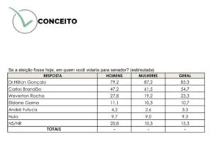 Já em Santa Rita, o desempenho de Hilton é expressivo entre todos os gêneros: ele alcança 87,2% entre as mulheres e 79,2% entre os homens. Em segundo lugar aparece o governador Carlos Brandão, com 54,7% das intenções de voto — sendo 61,5% do público feminino e 47,2% do masculino.