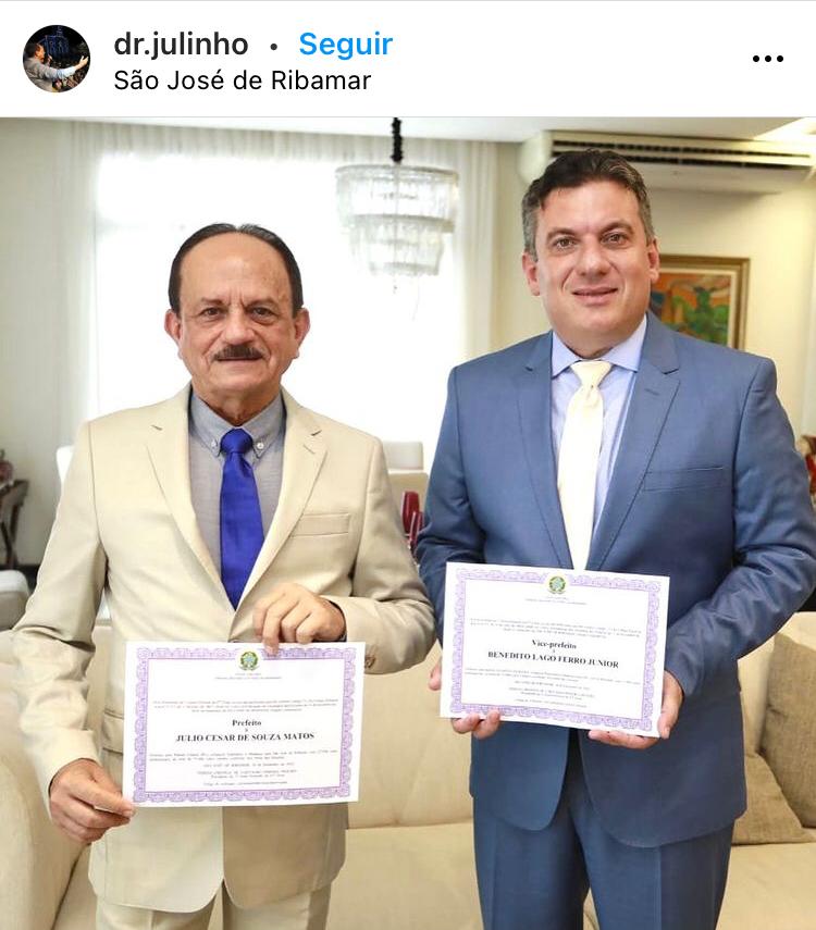 O prefeito eleito de São José de Ribamar, Dr. Julinho (PL), e seu vice-prefeito, Júnior Lago (Avante), serão diplomados nesta sexta-feira (18), em sessão remota realizada pela Justiça Eleitoral, obedecendo protocolos em decorrência da pandemia.