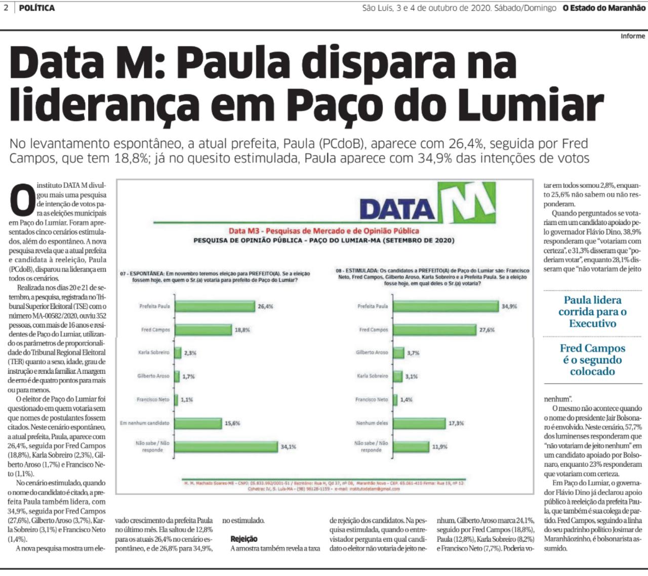 Nesta semana, foi divulgado o resultado da pesquisa do instituto Data M, em Paço do Lumiar.