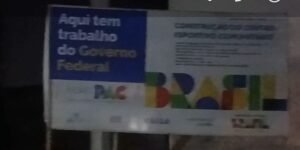 O material, que fazia parte da sinalização de transparência pública, trazia a frase “Aqui tem trabalho do Governo Federal” e indicava que a construção fazia parte do PAC (Programa de Aceleração do Crescimento).